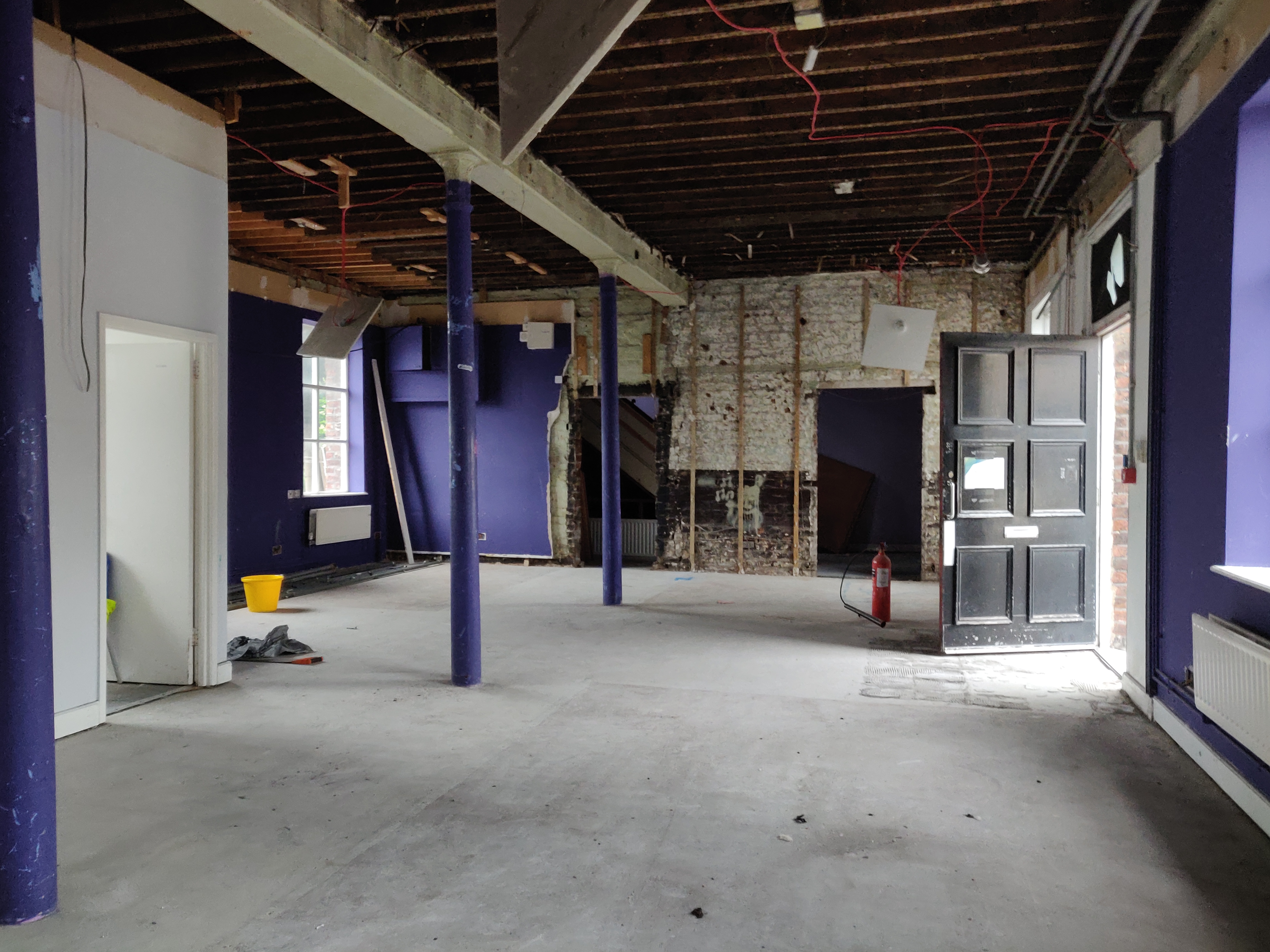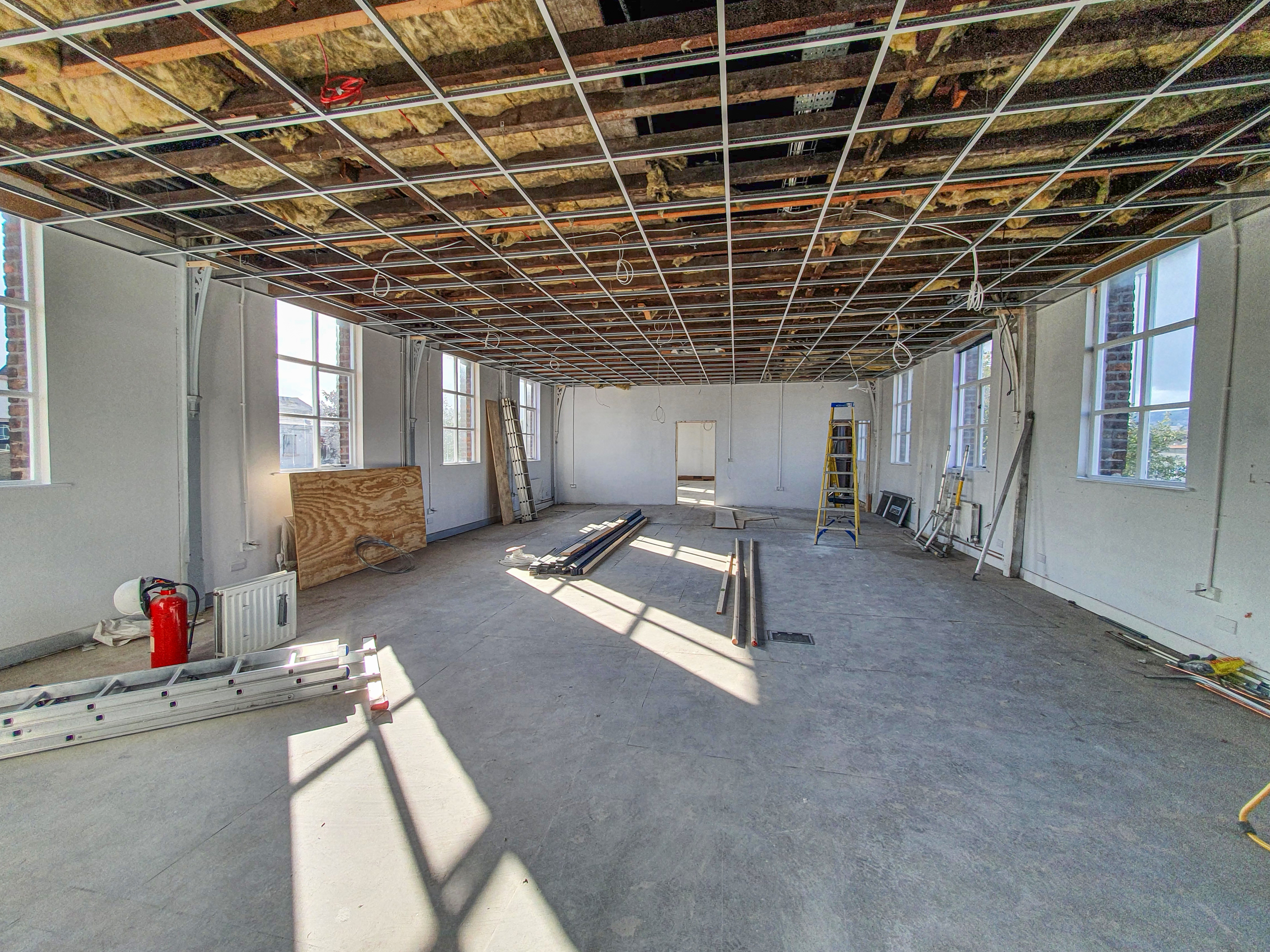 Walking past the ground floor lift lobby and into what was the old co-working space, the camera finds itself in the south western corner, where the networking cabinet used to sit. The alcove to right and the wall on the other side of the entrance hallway will both have lockers* for member storage installed in them. It is our current intention to fabricate some desk-level benches in the middle of the room and at the windows, offering comfortable and generous hotdesking space with power sockets and proper seating. Note the much higher plastered ceiling throughout the ground floor, exposing the beautiful ironwork and central wooden beam, which gives the whole space a very light and airy feel.