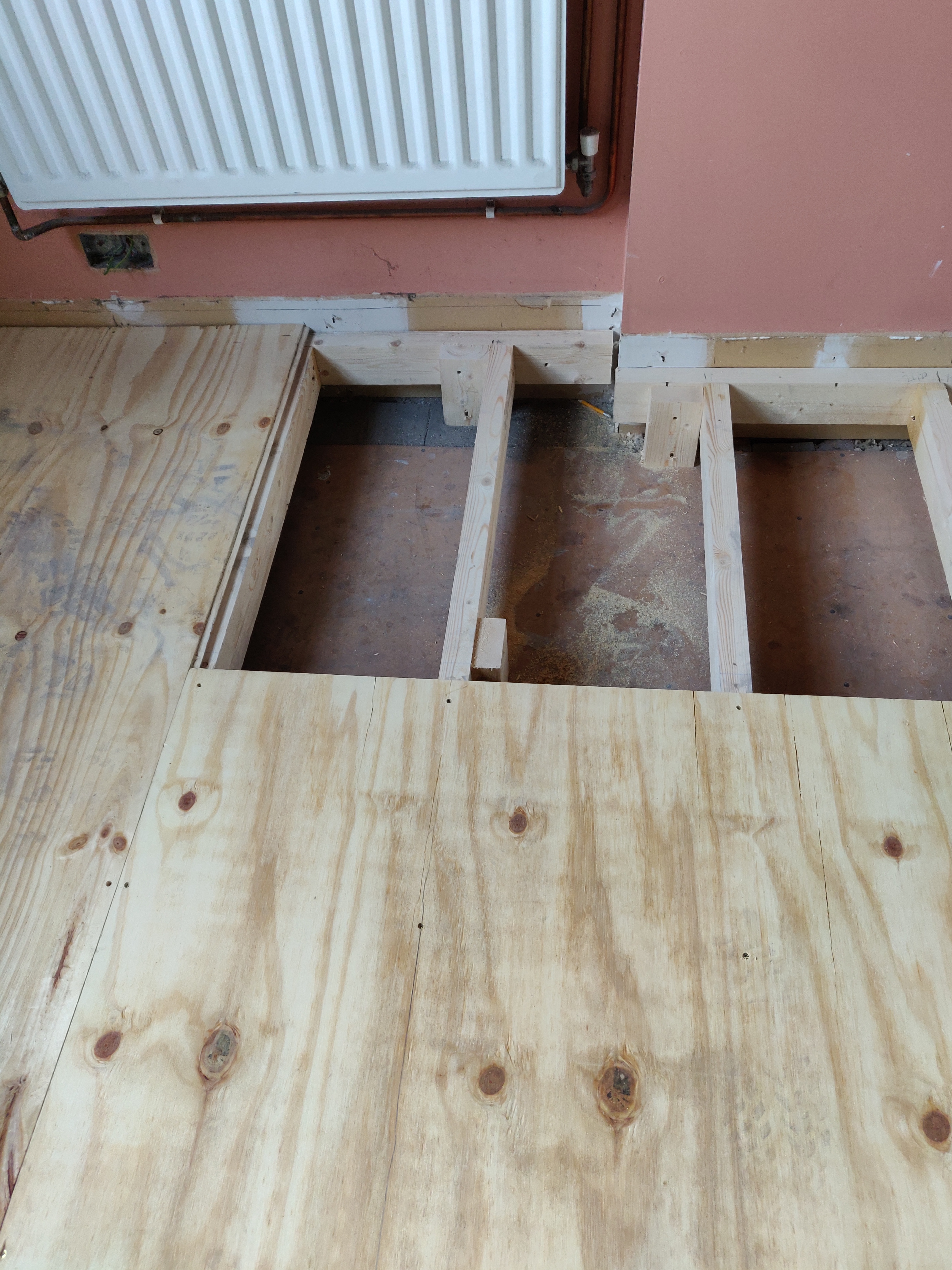 Anyway, back to the summertime work: due to the floor settling unevenly at the western end over the last century and a half, the joiners moved in to rectify the problem.