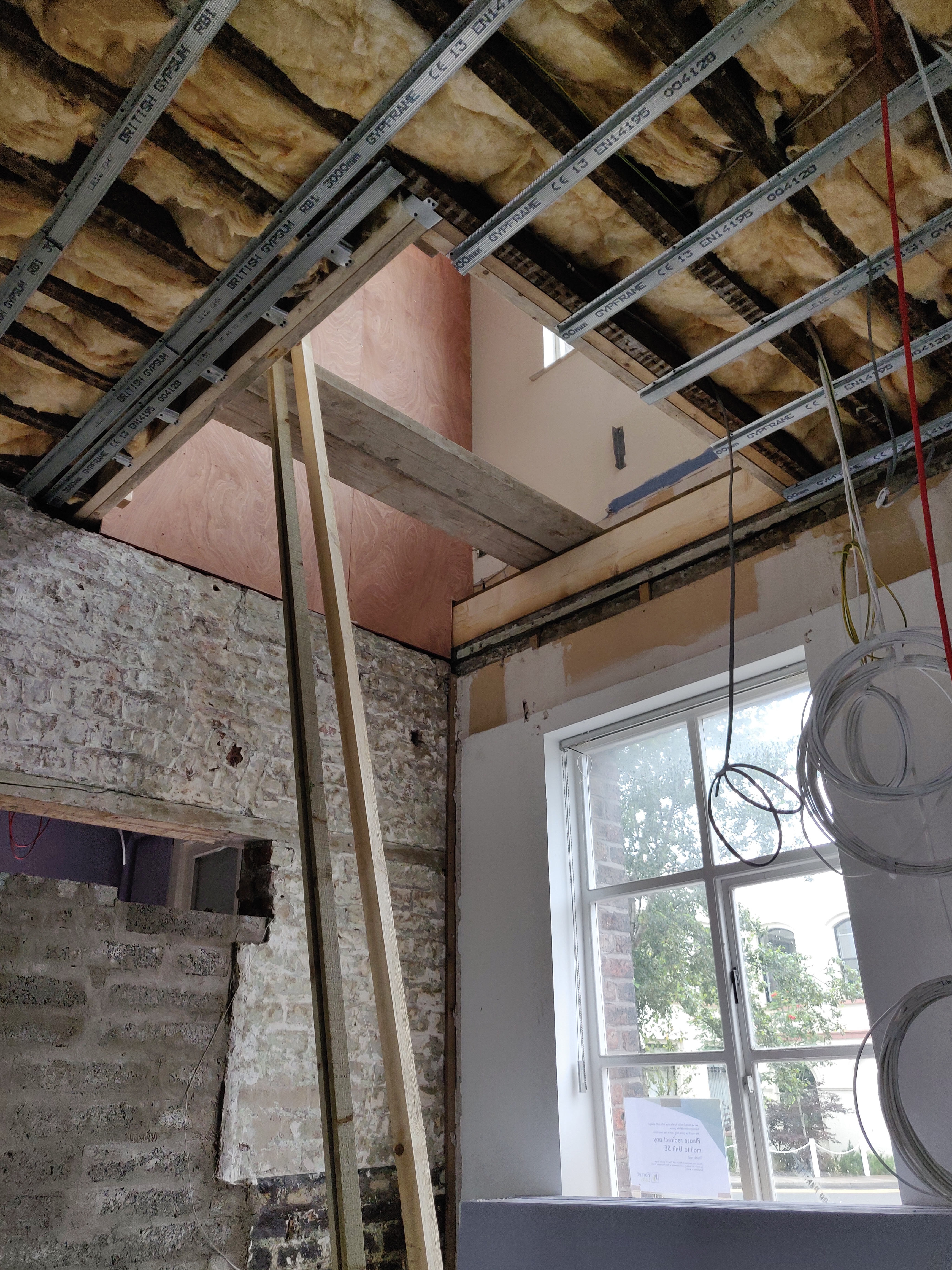 Facing south, we find ourselves in the meeting room, now with the plasterboard on, which will have a large monitor for presentations, teleconferencing kit for collaboration*, and space for up to seven people to meet privately…